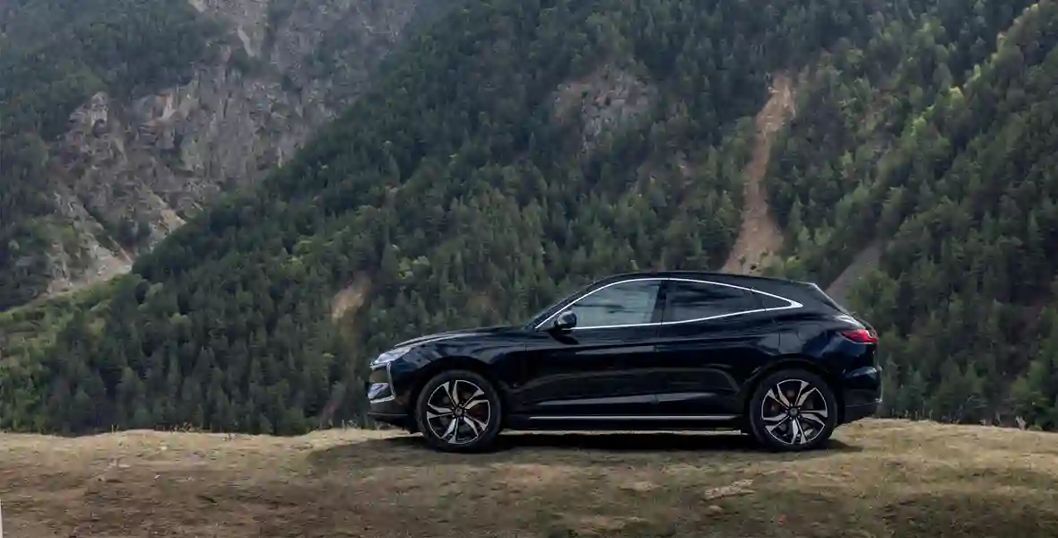 Формой кузова EVOLUTE i‑JET напоминает о Porsche Macan — особенно похожа задняя часть, где с немецким спортивным кроссовером его роднят не только светодиодные фонари во всю ширину, но и расположенная на креплении стеклоочистителя кнопка открывания двери багажника.