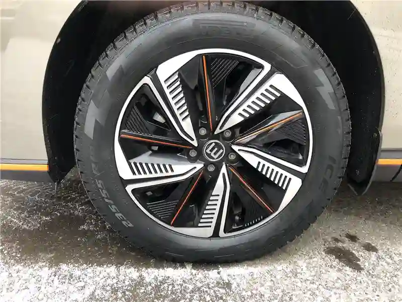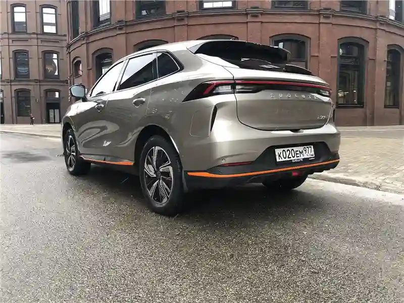 Внешность у EVOLUTE i‑SKY футуристическая, но не вычурная. Длина – 4565 мм, ширина 1860 мм, высота 1680 мм. Колёсная база 2715 мм, клиренс 175 мм. Кросс-купейного типа кузов, огромные светодиодные полумесяцы передней светотехники, массивная горизонтальная «штанга» задней, во всю ширину кузова. Изящная волна выштамповки по всей боковине кузова от носа до кормы, с повышением в конце. Оранжевые молдинги каймой идут по пластиковому обвесу кузова. Вид спереди – на любителя, сзади – твёрдая четверка, профиль навевает воспоминания, например, об Audi Q5, в общем, за экстерьер – четвёрка с плюсом как минимум.