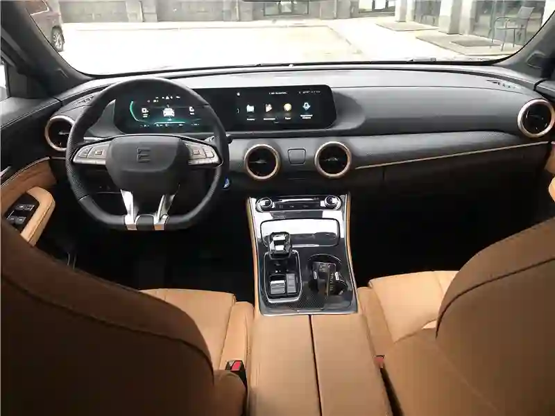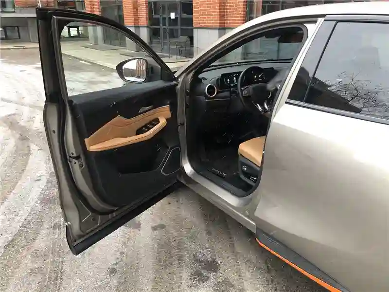 В салоне тестовой машины – сочетание кожзама абрикосового цвета и темного пластика с вставками под алюминий. Материалы недорогие, но благодаря грамотному цветовому сочетанию выглядят дорого. Два одинаковых по размеру экрана, 10,25-дюймовых – приборная панель и экран мультимедиа в центре передней панели. Есть блютус, нет интеграции со смартфоном, но можно «зеркалить» экран смартфона через приложение Carbitlink. Немного странно смотрится панорамная крыша c эффектом «звездное небо» – днем, когда солнцезащитная шторка открыта. Кажется, к стеклу крыши снаружи прилипло что-то, вроде звездочек от детской хлопушки.